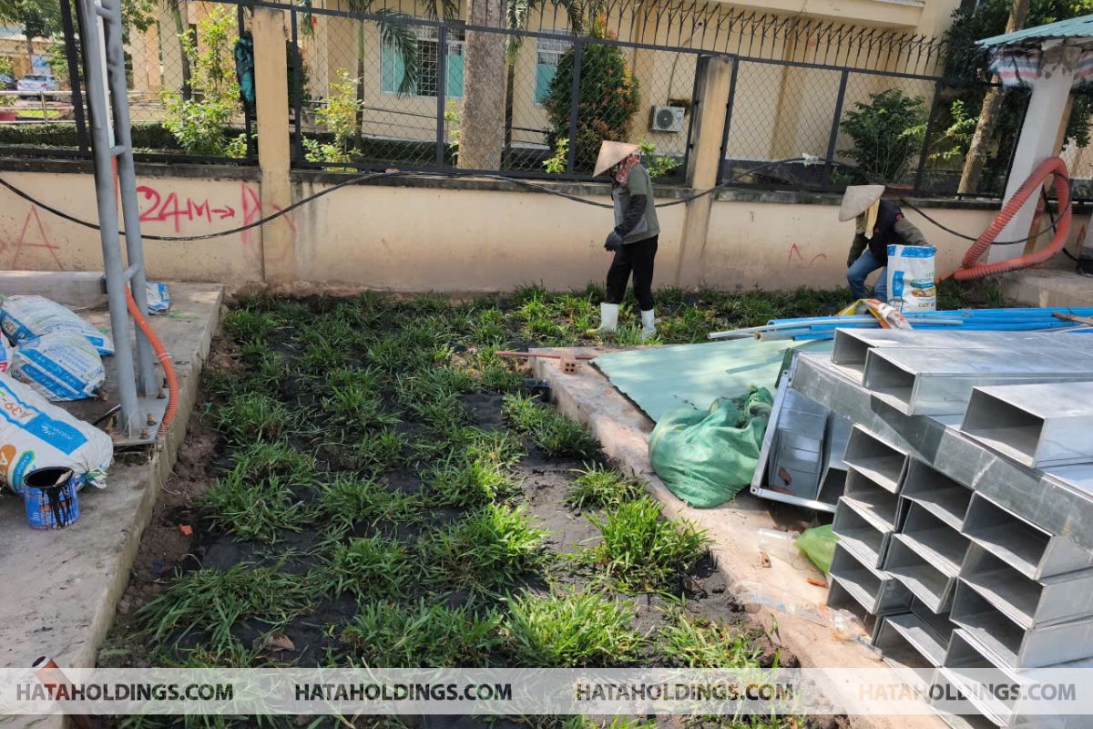 Trong suốt quá trình thi công, HATA chú trọng từng chi tiết – từ việc xử lý nền đất, tạo độ thoát nước hợp lý, đến khâu cố định và dưỡng cây nhằm đảm bảo khả năng sinh trưởng ổn định. Các cây được chọn đều có chất lượng tốt, tán đều, thân khỏe và phù hợp điều kiện khí hậu tại Củ Chi. Toàn bộ vật liệu và cỏ trồng được HATA kiểm định kỹ, giúp thảm cỏ phát triển đồng đều, duy trì sắc xanh lâu dài và giảm thiểu công chăm sóc.