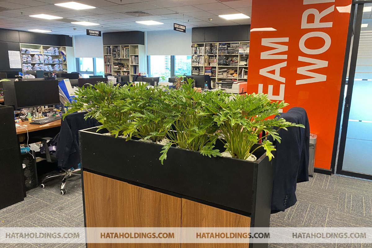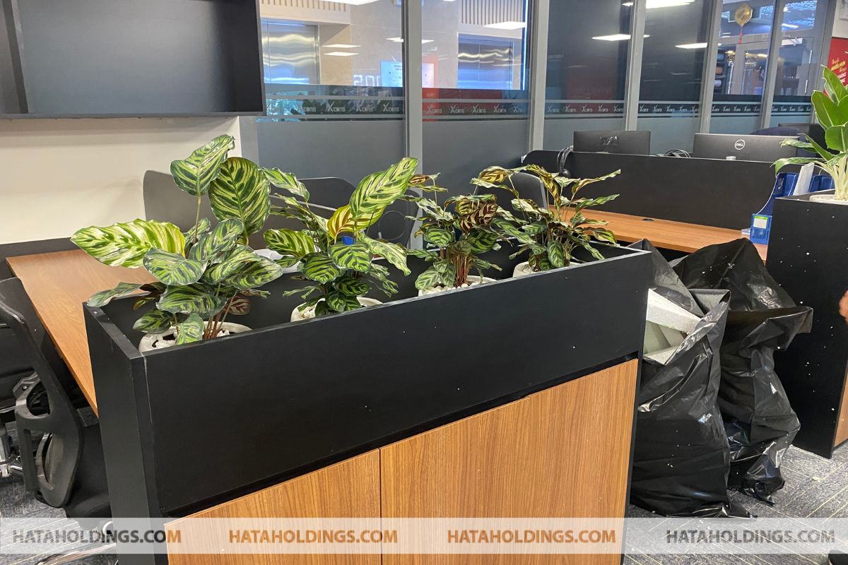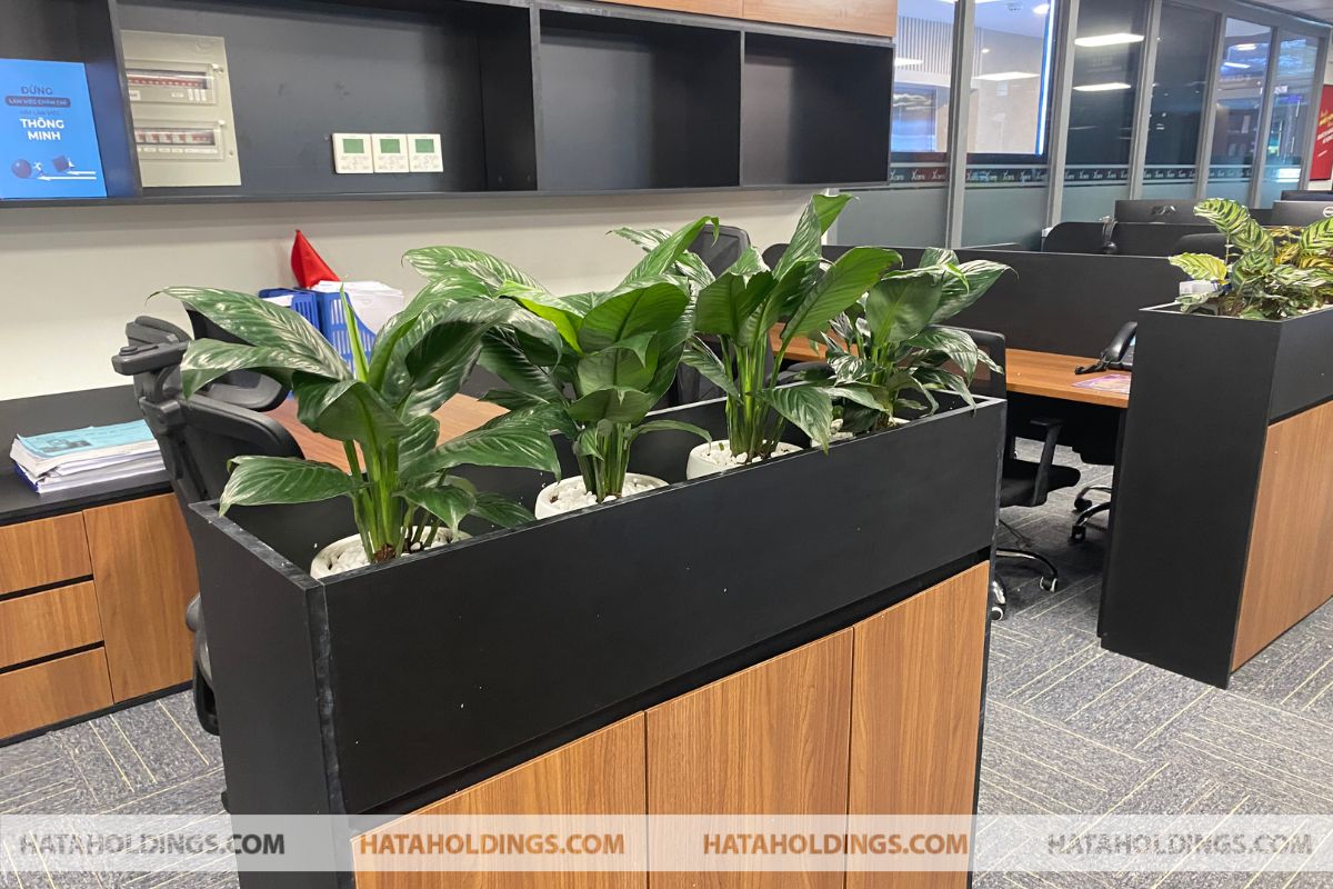 Điều khiến dự án này đặc biệt nằm ở cách HATA bố trí cây như một phần trong thiết kế tổng thể. Thay vì đặt cây rời rạc, các chậu cây được lồng ghép vào kệ gỗ đen – nâu, tạo nên sự liền mạch về màu sắc và cấu trúc. Mỗi dãy bàn làm việc được chia tách tinh tế bằng những cụm cây nhỏ, vừa đảm bảo sự riêng tư, vừa không phá vỡ tính kết nối của không gian mở. Sự xuất hiện của mảng xanh khiến cả văn phòng trở nên mềm mại hơn, ánh sáng phản chiếu qua từng chiếc lá cũng tạo cảm giác dịu mát và thư thái.